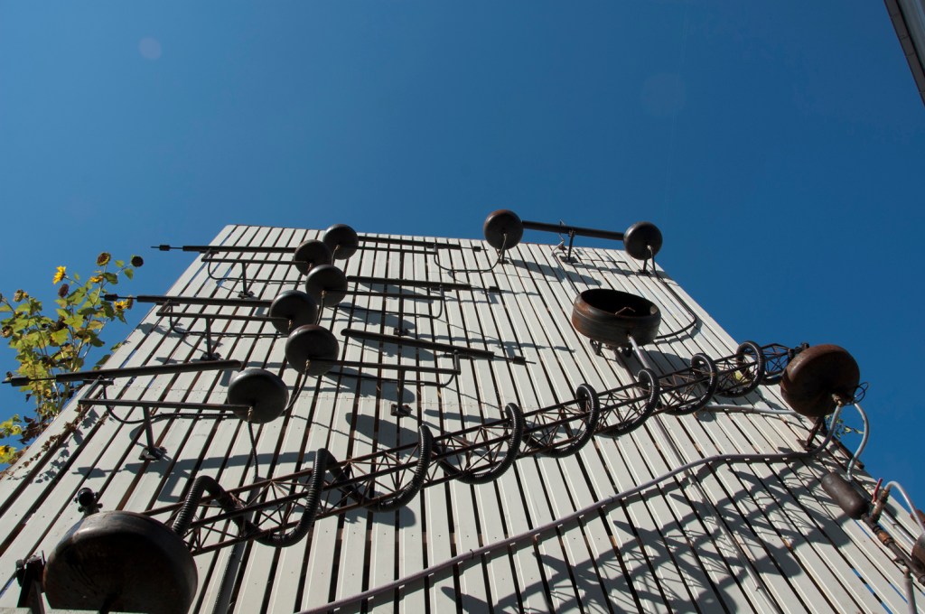 Die Gartenflächen von Time’s Up, am Rande der Linzer Industriestadt, zwischen Hafen und Donau, wurden in den letzten Jahren als urbaner Garten angelegt, mit experimentellen Beetformen, recycelten Gegenständen und mechanischen Systemen für Bewässerung, Kompostierung, Pflanzenbewegung und anderen praktischen und ästhetischen Zwecken.