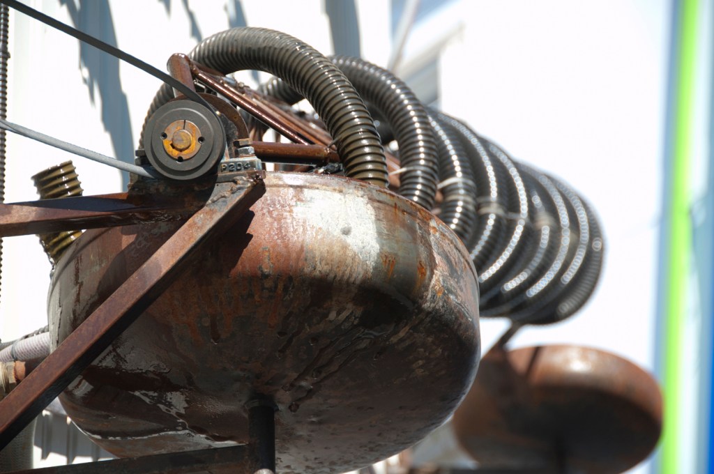 Gepflegt und gehegt erhalten wir eine blühende Umwelt im Freien, eine produktive Gartensituation, die neo-handwerkliche Techniken anwendet, um vor- und frühindustrielle Fertigkeiten mit modernen Technologien zu mischen, um autonome und intelligente, praktische und ästhetische, mechanische skulpturale Elemente zu erhalten.